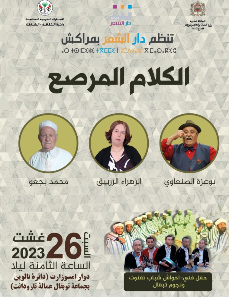 ويشارك الشاعر “أنظام” محمد بجعو، الى جانب فرقة أحواش شباب تفنوت بأمسوزارت، في لحظة شعرية وفنية تجمع أرقى فنون القول الإبداعي. استعادة للذاكرة الجمعية وانفتاح على أنماط الفرجات الشعبية المغربية، حيث يلتقي الشعر بالغناء والرقص الجماعي. اختارت فقرة “الكلام المرصع”، هذه المرة، أن تخلق حوارا شعريا زجليا أمازيغيا ضمن احتفاء دائم بالتعدد اللساني والتنوع الثقافي المغربي. هي شجرة الشعر المغربي الوارفة بخصوبتها وألقها، وهذا التعدد المميز لهويتها الإبداعية الرحبة، وسفر جديد لدار الشعر بمراكش الى المناطق البعيدة، والهوامش، في استعادة لحميمية التظاهرات الثقافية القريبة من الوجدان الشعبي المغربي.