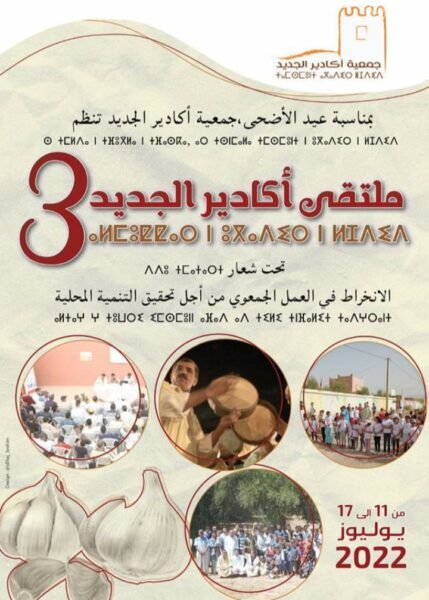بمناسبة عيد الأضحى المبارك، تنظم جمعية اكادير الجديد الدورة الثالثة ل ملتقى أكادير الجديد ، وذلك في الفترة الممتدة ما بين 11 و 17 يوليوز 2022 بأكادير الجديد ، جماعة تزكزاوين بإقليم تارودانت، تحث شعار الانخراط في العمل الجمعوي من اجل تحقيق التنمية المحلية .